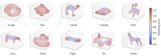 Figure 5 shows per-point error heatmaps between the denoised outputs and the ground-truth shapes, where the color represents the Euclidean distance to the corresponding ground-truth point. All samples consist of 10 k points, and the input noise follows a Gaussian distribution with a standard deviation of 1% of the unit sphere. Overall, our method achieves low reconstruction errors across most surface regions, especially in smooth and planar areas such as the camel’s torso and the cow’s flank. These regions are predominantly rendered in blue, indicating accurate point-wise recovery. However, increased reconstruction errors are observed in geometrically complex areas, including thin structures and high-curvature boundaries, such as for the camel’s legs, the edges of the chair’s backrest, and the tail of the horse. These failure cases typically arise due to the local sparsity or overlapping noise in the input, which can distort fine geometric cues during denoising. To mitigate these localized failures, future work may focus on stabilizing the adversarial training process and improving the loss function to better capture fine-grained geometric discrepancies. In particular, incorporating region-aware weighting schemes or multi-scale structural constraints into the training objective could enhance the model’s sensitivity to delicate features. These improvements may lead to more faithful reconstructions in challenging regions.