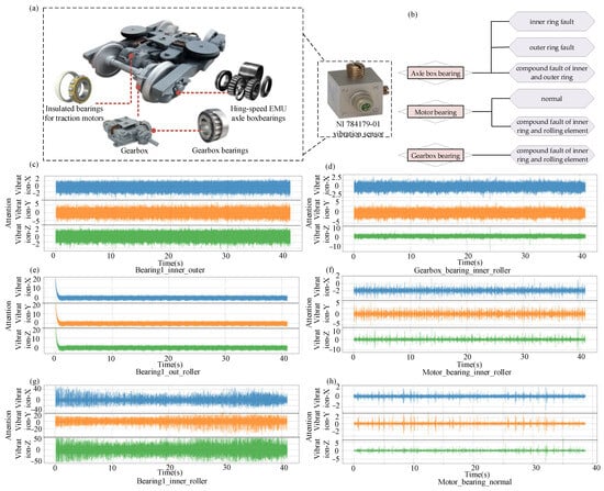 Figure 2b–i. This dataset significantly enriches the diversity of fault morphologies and operating modes specific to gearbox components and effectively complements the high-speed train running gear bearing fault dataset, thereby providing a robust data foundation for the evaluation of intelligent fault diagnosis systems for both high-speed train running gears.