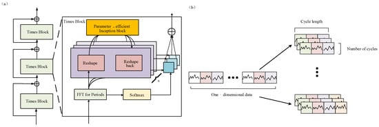 18]. By introducing a multi-period decomposition and two-dimensional spatio-temporal feature modeling architecture, TimesNet effectively transcends limitations inherent in traditional time series models. Its core innovation reshapes one-dimensional time series into two-dimensional tensor representations, enabling simultaneous modeling of intra-period temporal variations and inter-period frequency-domain evolution. Compared to conventional methods, TimesNet exhibits striking advances across diverse time series prediction tasks, achieving average performance improvements exceeding 15% [