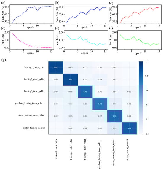 During the training phase of the high-speed train running gear bearing fault dataset, key model performance indicators such as accuracy and loss steadily improved and eventually stabilized as the number of training epochs increased. The trajectories of these metrics exhibited a clear optimization trend, suggesting that the model possesses stable convergence and robust generalization capability. Ultimately, the test set accuracy reached 0.917, demonstrating the model’s high efficiency in anomaly detection and classification. Further analysis of the normalized confusion matrix revealed that the model achieved classification accuracy above 0.75 for most bearing fault categories (e.g., bearing1_inner_outer, bearing2_outer_roller, bearing3_inner_roller, motor_bearing_inner_roller, motor_bearing_normal). This indicates minimal misclassification or missed detection, highlighting the model’s strong capability in extracting discriminative features and accurately identifying fault types. For the gearbox_bearing_inner_roller category, although some degree of misclassification was observed, the recognition rate remained relatively high at 0.72. These results confirm that the model maintains strong discriminative performance even under conditions of limited sample size and noise interference, see