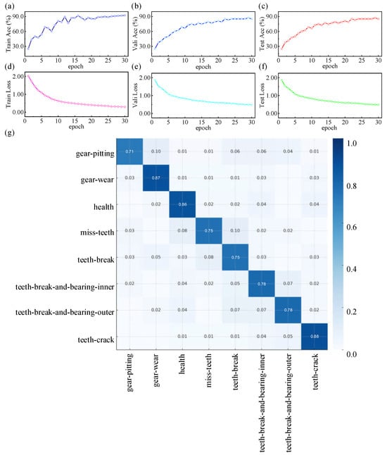 During training on the multi-modal gearbox fault diagnosis dataset under various operating conditions, the model’s accuracy steadily increases while the loss metric rapidly decreases and gradually stabilizes as the number of training epochs progresses. This trend demonstrates that the model maintains excellent stability throughout the optimization process and is capable of effectively learning and extracting time series features, even in highly complex and multi-modal environments. The final validation results show that the test set accuracy reaches approximately 0.875, reflecting the model’s strong discriminative capability. A detailed analysis of the normalized confusion matrix reveals that classification accuracy exceeds 0.71 for the majority of fault categories, including gear_pitting, gear_wear, healthy, miss_teeth, teeth_break, teeth_break_and_bearing_inner, teeth_break_and_bearing_outer, and teeth_crack. This indicates that the TimesNet model demonstrates superior performance in accurately identifying most typical fault types and normal states. Furthermore, the confusion matrix shows that misclassifications are primarily confined to adjacent categories, with no widespread errors or omissions. These findings further confirm the TimesNet architecture’s strong discriminative power in multi-class fault classification and its overall robustness.