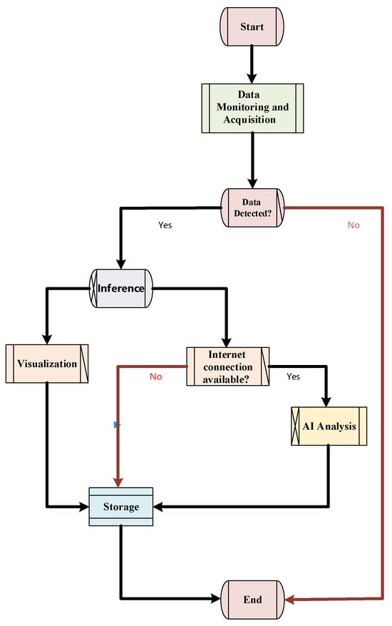 Figure 7. Firstly, the system automatically monitors and detects .npy and .csv directories in USB flash drives or other external storage devices through the data collection module (see detect_usb and collect_npy_files functions), thereby achieving intelligent recognition and loading of original fault samples. Once valid data is detected, the system prompts the user via the graphical interface to select samples for inference and proceeds to the subsequent processing stage. If no required data is detected, the system issues an exception alert through the Tkinter interface, halts further operations, and displays the message “No .npy/ or .csv/ directories detected”. After data validation and initiation of inference, the system enters the inference phase. Using a thread pool (ThreadPoolExecutor), it asynchronously executes the run_inference module in the background, completing the deep learning-based fault identification process. Upon completion of inference, the system automatically associates the corresponding .csv or Excel files based on the identified fault categories. Within the Matplotlib (version 3.7.1) visualization environment, the _plot_csv and _plot_excel functions display fault time series or vibration data in various formats, enabling intuitive data interpretation and real-time human–machine interaction. Meanwhile, if network connectivity is available, the ask_DeepSeek (version 3.1) function asynchronously invokes the DeepSeek-reasoner large language model API to provide targeted debugging and maintenance recommendations for the predicted fault categories; otherwise, the function remains inactive and DeepSeek cannot be called. The analysis results are dynamically displayed in real time through the ScrolledText module, supporting user decision-making. All inference outputs and AI analyses can be locally archived using modules such as save_current_results and save_analysis. The system also supports integrating Matplotlib-generated visualizations with AI-derived analysis results into a unified PNG format report and exporting the analysis text in standard formats such as txt and md for archiving and future traceability. Overall, this workflow constitutes a robust closed-loop system covering data acquisition, fault inference, visualization, AI-assisted analysis, and result storage, with all core functionalities encapsulated within dedicated class methods.