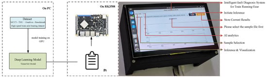 Based on the above analysis, this study presents one of the pioneering applications of the TimesNet framework in multi-class fault diagnosis for rail transit running gear. To address the multi-scale periodic characteristics of operational condition signals from high-speed train running gear, an intelligent fault diagnosis method based on the TimesNet framework is proposed. The method achieves accurate modeling under complex working conditions through one-dimensional to two-dimensional time series reconstruction combined with a multi-scale convolution mechanism. A human–machine interaction system is designed and implemented, integrating sensor signal acquisition, intelligent diagnosis, visual analysis, and maintenance decision suggestions into a closed-loop workflow, thereby validating the method’s applicability in real-world operation and maintenance scenarios. Furthermore, to meet practical engineering requirements, the model is first trained on a high-performance workstation and then transferred and deployed on the Rockchip (RK) 3588 Advanced RISC Machine (ARM)-based edge embedded platform for rigorous validation. The feature modeling capability of TimesNet in industrial multi-sensor time series data processing is both theoretically analyzed and experimentally verified, demonstrating its advantages in capturing periodic patterns and suppressing noise.