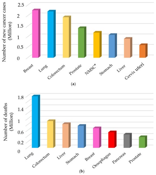 (a) The incidence of new cancer cases and (b) fatalities attributed to cancer in the year 2020. * NMSC: Non-melanoma skin cancer.