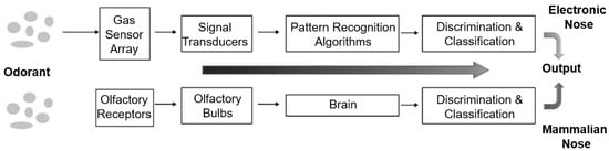 An illustrative diagram displaying the structure of the mammalian nose in comparison with an e-nose.