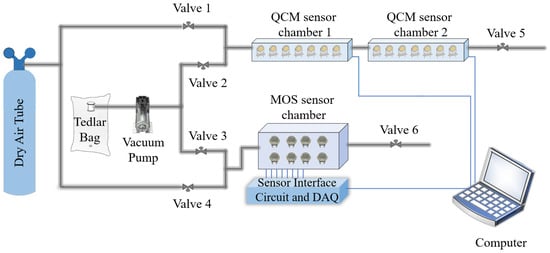 QCM sensors were produced at TÜBİTAK Marmara Research Center. The researchers used AT-cut quartz crystals supplied by Klove Electronics (Westerlo, Belgium) in this study. Before application, a flow of dry air was used to remove the residual solvent from the QCM sensors. To ensure chemical selectivity, the crystal surfaces were coated with chemically sensitive films. In this study, vic-dioximes, poly(3-methylthiophene) (PMeT), axially substituted titanyl phthalocyanines (TiOPcs), vanadium pentoxide (V2O5), polypyrrole (PPy), and the copolymer of poly(3-methylthiophene) with polypyrrole (P3MT-co-PPy) were used as sensing materials. Owing to their high surface activities, chemical functionalities, and affinities for various cancer-related biomarkers, these coatings have been successfully applied in the literature as QCM sensing layers for the detection of volatile organic compounds (VOCs) [42,43,44,45]. The frequency values produced by the QCM sensors were detected using an internal frequency counter circuit and transferred to a computer. Thus, frequency information corresponding to the breath samples was acquired. Images of the QCM sensor chambers used in this study and a block diagram of the internal frequency counter circuit are shown in Figure 7 and Figure 8, respectively. Dry airflow was used to remove gas samples. The MOS and QCM sensors used in this study are shown in Figure 9. Figure 9a–d show the different types of MOS sensors used, while Figure 9e shows the type of QCM sensor used. Before and after all experiments, the entire system was cleaned with dry air containing 21% oxygen and 79% nitrogen. The flow rate of the dry air in the system was fixed at 10 L/min. Teflon pipes were used to accurately direct both dry air and breath samples to the appropriate sections. Teflon pipes do not react with most chemicals and do not retain odor molecules, thereby preventing any residual unwanted odor molecules from previous experiments from remaining on them. A vacuum pump powered by a 12 V DC supply was used to deliver breath samples to the sensors. The constant voltage of the vacuum pump ensured uniform delivery of the breath samples into the sensor chambers. The voltage supplied to the vacuum pump was determined during the installation phase of the e-nose system. During this phase, the volumes of the Tedlar bags and sensor chambers were collected, and the breath samples were introduced to the sensors at a flow speed of 3.6 L/min. Six solenoid valves were used in the experiments to send the breath samples and dry air directly. These valves, branded JELPC (JELPC, Zhejiang, Ningbo, China), had electrical working values of 24 V (DC) and 4.8 W. A control card circuit was designed to transfer the required energy to the valves, and a vacuum pump was used in our study. With the help of this control card, the valves and vacuum pump are activated for appropriate periods, and the experiments can be conducted as desired. A visual representation of the experimental setup is shown in Figure 10. The experiments were divided into four distinct phases. The first phase involved purging the system with dry air for 130 s. Following the initial cleaning, the vacuum pump transferred the collected breath to the QCM and MOS sensor chambers over a period of 40 s. Subsequently, all valves were closed, allowing a 30 s period for the sensors to react to the collected breath. Finally, the entire circuit underwent a 140 s cleaning cycle with dry air to prepare it for the next experiment. In this study, constant temperature and humidity levels were maintained by using air conditioning in the laboratory room where the experiments were conducted.