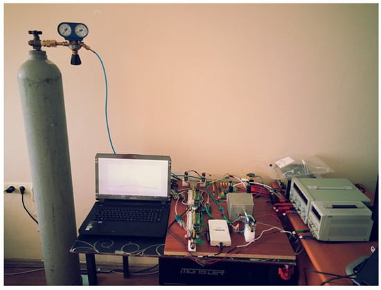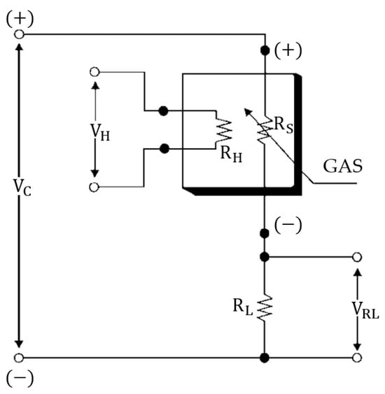 A block diagram of the e-nose circuit, which was used to perform breath analysis in this study, is shown in Figure 4. The experimental setup consisted of five components: dry air tubes, Teflon pipes, a vacuum pump (POM-VAK, Istanbul, Turkey), solenoid valves (JEL-PC, Ningbo, Zhejiang, China), a quartz crystal microbalance (QCM) sensor cell (TUBITAK MRC, Kocaeli, Turkey), an MOS sensor cell (Altinkaya, Ankara, Turkey), a sensor interface circuit, a control card, an analog digital data acquisition card USB-6218 Multifunction I/O Device (National Instruments, Austin, TX, USA), and a computer (Monster Tulpar T7, Istanbul, Turkey). To determine the MOS sensors (Figaro Engineering Inc., Osaka, Japan) to be used, studies in the literature were reviewed and analyzed. VOCs present at varying concentrations in the breath profiles of patients compared to those of healthy individuals were identified, and sensors were selected to detect these VOCs. The basic measuring circuit of the MOS sensors is shown in Figure 5. In this figure, and represent the circuit and heater voltages, respectively. The circuit and heater voltages of the MOS sensors used in this study are listed in Table 1. and represent the load resistance connected in series with the sensor and the voltage value obtained across this resistance, respectively. The values of the load resistors for the MOS sensors are given in Table 2. Also, the detailed specifications for the MOS sensors are provided in Table 3. The data from the MOS sensors were transferred to the computer using a USB-6218 Multifunction I/O Device.