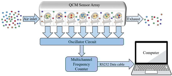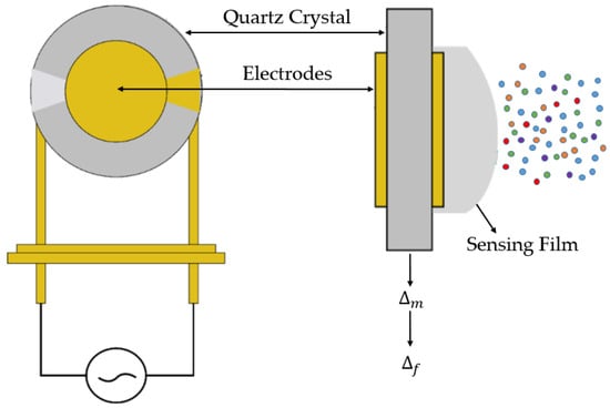 Δf is linked to the quantity of the sample that is adsorbed or desorbed, while D is associated with the sample’s stiffness and viscoelastic properties. The frequency change is measured and relayed to a computer via an appropriate electronic circuit. By analyzing this frequency shift, valuable insights about the target gases can be obtained. The basic working principle of a quartz crystal microbalance sensor can be seen in Figure 6.