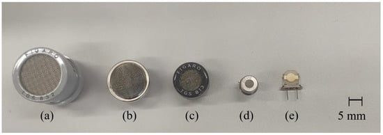 QCM and MOS sensors utilized in this study. (a–d) different types of MOS sensors used, (e) the type of QCM sensor used.