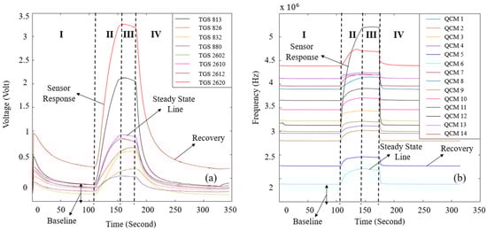 The durations of the phases were predetermined during the design of the experimental setup. In preliminary trials, longer durations were tested; however, once the sensor responses reached a stable trend, extending the phase time did not yield additional benefits. Therefore, the transition to the next experimental stage was initiated after this stabilization point. A randomly selected sample from the data of the MOS and QCM sensors is shown in Figure 11. In this Figure, the behavior of the sensor data at the stages of the experiment can be seen.