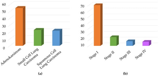 (a) Distribution of patients based on the histological type of cancer and (b) distribution of patients according to the cancer stage.