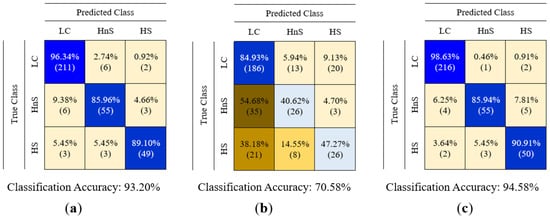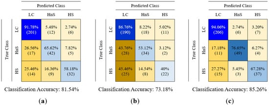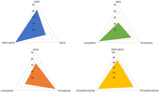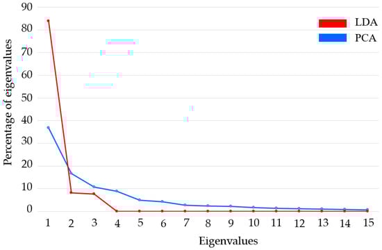 The size of the feature matrix created using the QCM sensors was (338 × 7). The feature matrices obtained in this study were classified without reducing the size of the feature matrix and by reducing the size of these matrices using linear discriminant analysis (LDA) and principal component analysis (PCA) algorithms. When using these algorithms, care was taken to ensure that the data with a reduced size contained at least 90% of the information contained in the main data. The initial dimensions of the feature matrix derived from the MOS sensor data were (338 × 91), which were reduced to (338 × 11) and (338 × 2) through the application of LDA and PCA, respectively. The initial dimensions of the feature matrix derived from the QCM sensor data were (338 × 7), and these dimensions were reduced to (338 × 4) and (338 × 3) by applying the LDA and PCA methods, respectively. Following these processes, a feature matrix with dimensions of (338 × 98) was generated by integrating the original feature matrices derived from the MOS and QCM sensors. In the remainder of this paper, this feature matrix is referred to as the hybrid feature matrix. The dimensions of the hybrid feature matrix were reduced using LDA and PCA. The size of the hybrid feature matrix was reduced to (338 × 14) using the PCA method and to (338 × 3) using the LDA method. The scatter graphs created using the first two features of the dimension-reduced hybrid feature matrix and the percentage contribution of eigenvalues for PCA and LDA are shown in Figure 17 and Figure 18, respectively.