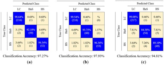 When the results of this study are compared with those of pioneering QCM-based clinical studies, the advantages of the hybrid approach become more apparent. Di Natale et al. achieved 100% accuracy for cancer, 94% for healthy controls, and 44% for post-surgery patients using QCM sensors functionalized with metalloporphyrins [32]. Gasparri and colleagues reported 81% sensitivity and 91% specificity (92% for stage I lung cancer) in a cohort of 146 individuals [33]. D’Amico et al. demonstrated sensitivities above 80% in distinguishing patients with cancer, healthy controls, and individuals with other lung diseases [34]. In this context, the hybrid MOS+QCM system developed in this study, which achieved an accuracy of 97.93%, a sensitivity of 98.64%, and a specificity of 96.64%, represents a significant improvement over systems relying solely on QCM sensors and highlights the advantages of integrating different sensor technologies.