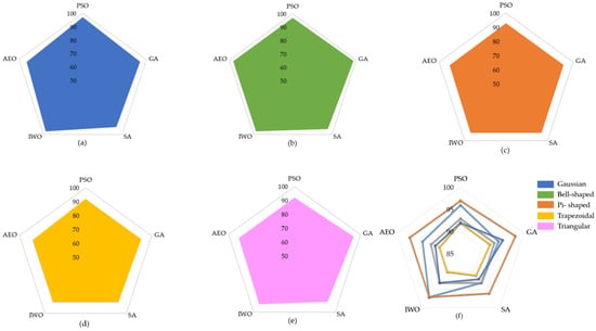 A comparative visualization of the classification performance across different methods: (a) Gaussian, (b) bell-shaped, (c) pi-shaped, (d) trapezoidal, (e) triangular, (f) mixed representation.