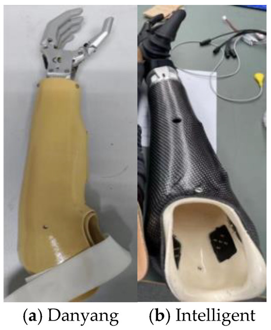 The prostheses utilized in this experiment include a double-degree-of-freedom (DOF) trans-radial prosthesis (SJQ22, Danyang Prosthetic Factory, Danyang City, Jiangsu Province, China) and an intelligent prosthetic hand designed and developed by Shanghai Jiao Tong University. The former offers hand grip and wrist movement as its two degrees of freedom. In contrast, the latter possesses multiple degrees of freedom, including wrist flexion and extension, wrist internal and external rotation, and multiple hand degrees of freedom. Prosthetic adaptation was individualized based on residual limb length, muscle condition, and coordination capacity. The trans-radial prostheses used in the experiment are illustrated in Figure 1, and detailed specifications are provided in Table 2. Additionally, the experiment employed devices such as boxes, wooden blocks, water cups, and wooden pegs.