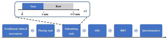 Paradigm of the initial prosthetic function assessment. The process began with a clinical assessment, followed by three repetitions of the placing and submitting task, then 10 ADL tasks, and finally five BBT trials assessing fine motor skills, followed by two questionnaires on experience with the prosthesis.