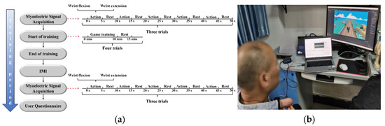 Paradigm and setup of sEMG-based training experiment: (a) Experimental paradigm for sEMG training. (b) Scene diagram of the training experiment.