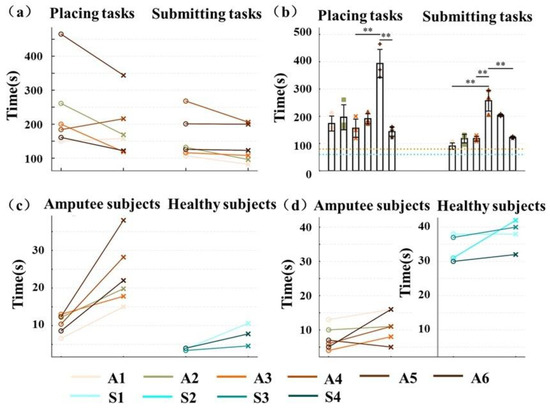 Results of the objective measures: (a) results of the placing and submitting task, with circles and forks representing the first and third trials, respectively; (b) bar charts of the placing and submitting tasks performed by six amputee participants, with the orange and blue dashed lines representing the standard time spent on the submitting task and the placing task, respectively; and (c) results of the ADL task, with circles and forks representing the average completion time (CT) for the simple task group and the complex task group, respectively; (d) results of the BBT task, with circles and forks representing the first and fifth trials, respectively. Note: ** indicates p < 0.01.