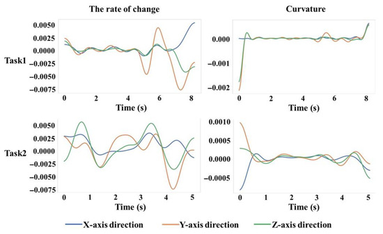 As shown in Figure 5, sudden peaks in the rate of change of acceleration and curvature curves indicate that the subject exhibited significant movement at specific moments. To evaluate movement smoothness, comprehensive analyses were conducted across all participants. For illustrative purposes, the acceleration profile of Subject A3 was selected due to the relatively complete muscle data and participation in subsequent training sessions. During Task 1, the rate of change was initially stable but later exhibited significant fluctuations, indicative of reduced smoothness. Nonetheless, the curvature profile remained consistent, suggesting a generally smooth motion. The acceleration rate of change profile of Task 2 continued to fluctuate, demonstrating a lower degree of smoothness. In summary, Task 1 (complex task, pouring water) displayed greater movement smoothness compared to Task 2 (simple task, moving lighter objects).