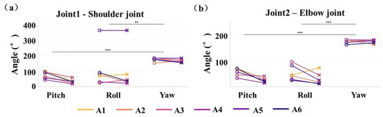 The ROM results for the three directions/axes (x, y, and z)/(pitch, roll and yaw) during Task 1 and Task 2 are shown in Figure 6, which (a) illustrates the shoulder joint ROM and (b) presents elbow joint data. The data indicated that the shoulder joint ROM spanned from 0 to 200°, and the elbow joint ROM extended from 0 to 180°. Notably, the z-axis ROM for A5’s shoulder joint exhibited an outlier, ranging from 300 to 400°. In summary, the ROM was significantly greater in the y-axis than along the x and z axes.