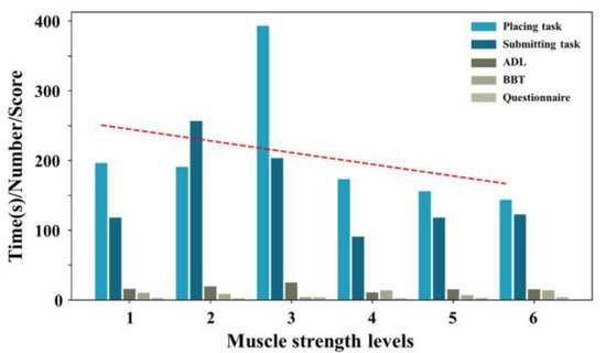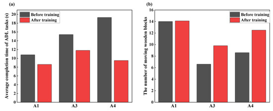 As shown in Figure 14a, the average CT of the ADL task after training was 9.97 s, significantly lower than the pre-training time of 15.17 s. Specifically, A3 and A4 had greater decreases in ADL CT (23.38% and 50.78%) than A1 (20.37%). As shown in Figure 14b, in the BBT task, the mean number of blocks moved by subjects in 60 s increased compared to the pre-training period. A1 demonstrated the smallest increase in the number of blocks moved (0.1 blocks), whereas A4 demonstrated the largest increase (3.9 blocks). Overall, A1’s performance was superior to that of the other subjects.