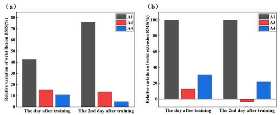 The increase in RMS of both wrist flexors and wrist extensors (Figure 9) after training was probably due to the enhanced muscle adaptation. However, the differences observed on the day after training, during which sEMG signal continued to increase in A1, whereas they decreased in A3 and A4, may be related to physiological conditioning during fatigue and recovery. The overall trend showed an increase in RMS values after training and on the second day after training, verifying the training’s impact on sEMG signals. The lowest RMS values in A1 may have originated from the congenital limb hypoplasia, resulting in more severe muscle atrophy [39]. The decrease in RMS values for A3 on the second day after training may have stemmed from the incomplete recovery of muscle or fatigue accumulation.