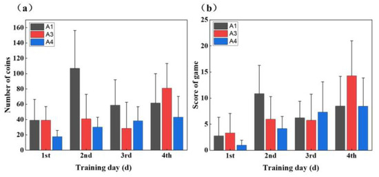 As shown in Figure 10, the subjects’ game performance (both the number of gold coins and game score) increased with increasing training days. Regarding these measures, the three subjects exhibited varying performances, with Subject A1 showing a significant increase on the second day, Subject A3 experiencing a decrease on the third day, and Subject A4 demonstrating a gradual upward trend.