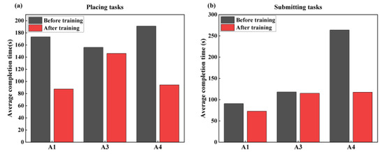 Comparison of completion time before and after training for different tasks. (a) Placing task and (b) Submission task.