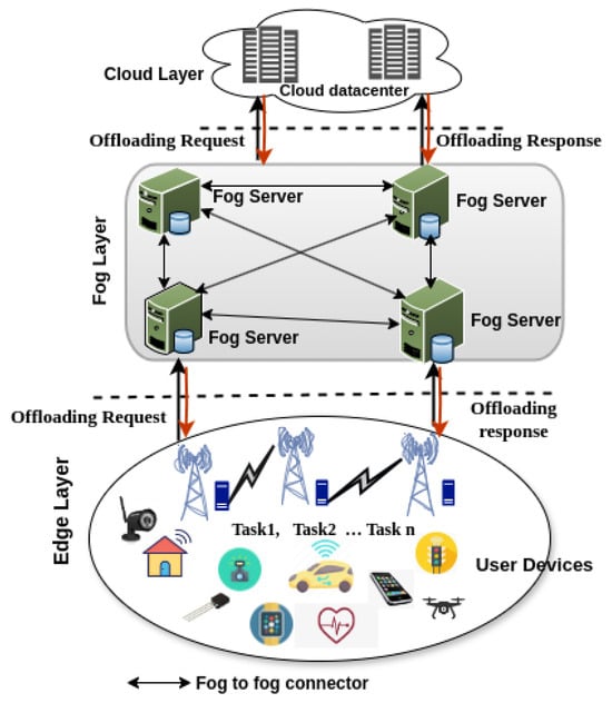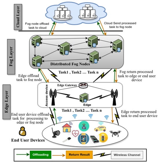Figure 1 shows a high-level task offloading architecture consisting of four layers: end-user devices, edge, fog, and cloud. The first layer includes various end-user devices with limited computing power. The second layer consists of edge nodes that offer immediate, low-latency support for task offloading and often operate closely with the end-user devices. The third layer, the primary focus of this article, is the fog layer, which provides distributed, intermediate computing resources located near the data source. Finally, the fourth layer comprises centralized cloud data centers, suited for large-scale processing tasks that are not time-sensitive.