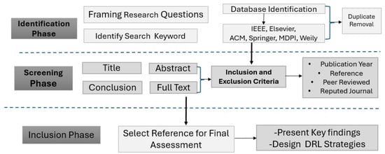 This survey covers research from 2017 to June 2025 on recent advances and emerging trends in DRL-based task offloading and resource allocation in fog computing. To ensure a rigorous and reproducible review process, we adopted a systematic methodology based on the widely recognized guidelines proposed by Kitchenham et al. [32] for conducting systematic literature reviews in software engineering. This structured approach enables the identification, evaluation, and synthesis of relevant studies in a transparent and methodical manner. As illustrated in Figure 2, the methodology is organized into three main phases, each designed to support a clear progression from research question formulation to literature selection, data extraction, and synthesis of the findings [33].
