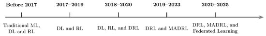 Figure 6 illustrates the progression of the learning algorithms used in the computation offloading and resource allocation in fog computing environments. Initially, traditional ML, DL, and RL techniques were applied in centralized device-to-cloud offloading models. This was followed by the adoption of decentralized offloading in device-to-edge-to-cloud systems, device-to-MEC, and device–fog–cloud, and the emergence of MADRL for multi-UAV and multi-agent fog coordination. More recently, the field has shifted toward decentralized and federated MADRL in fog and edge environments.