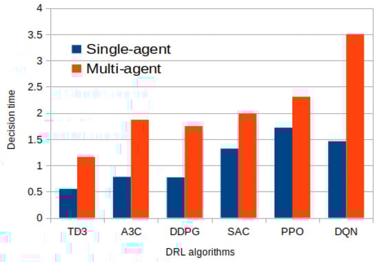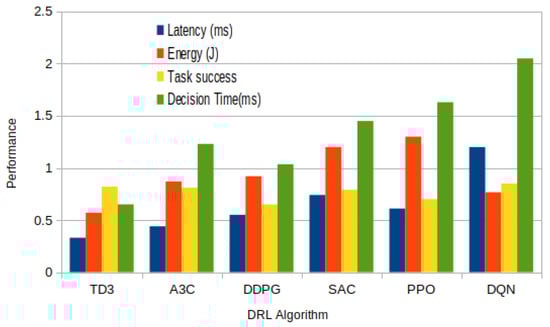 This section presents a comparative analysis of DRL in relation to DL and RL, followed by a discussion on the empirical distribution of various DRL algorithms. The pie chart in Figure 8 extracted from our database shows that RL techniques are the most commonly used approach by 36.02% to solve the joint task offloading and resource allocation decision problem, followed by DL 27.72%, DRL 25.21%, and MADRL 11.05%. This shows that DRL with the MADRL approach accounts for 36.26%, indicating a substantial increase in the adoption of DRL algorithms for task offloading and resource allocation in fog environments.