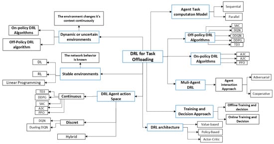 Several studies have surveyed fog computing from a range of perspectives, including resource allocation, infrastructure, algorithms, architecture, management models, and computation offloading [19,22,30,31]. While many of these works explore task offloading in fog environments, there is still limited focus on the opportunities and challenges presented by DL, RL, DRL, and federated learning (FL), particularly in the context of distributed fog node architectures. These gaps highlight the need for further investigation into adaptive task offloading strategies capable of operating in dynamic and heterogeneous fog computing ecosystems. To address this, the current study explores the application of AI/ML techniques, specifically, DL, RL, and DRL, for many-to-many task offloading and resource allocation. The scenario considered involves multiple smart user devices offloading tasks to multiple distributed fog nodes, aiming to meet the demands of real-time, latency-critical applications. In particular, the study focuses on how DRL can improve offloading decisions and optimize resource utilization between user devices and fog environments. It also provides insights into knowledge-driven multi-agent DRL approaches and their potential applications in emerging intelligent systems.