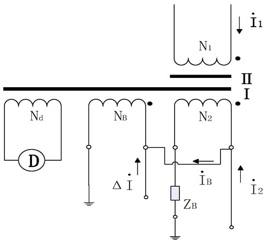 Principle diagram of compensated current comparator. N1, N2: Number of turns in the primary and secondary windings, respectively. NB: Number of turns in the compensation winding. I1, I2: Primary and secondary currents, respectively. Nd: Number of turns in the detection winding. ΔI: Error current. IB: compensation current. ZB: Load impedance.