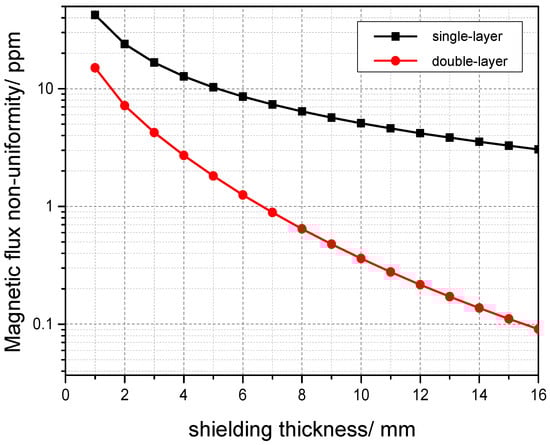 Selecting 10 mm thick permalloy as a single-layer magnetic shield, a double-layer is equivalent to stacking two single layers. Using analytical methods for calculation, the shielding effects of single-layer shielding and double-layer shielding are compared. Under the conditions of constant relative magnetic permeability and thickness, using 10 mm double-layer magnetic shielding can significantly reduce magnetic flux non-uniformity and improve the shielding effect [25].The simulation results are shown in Figure 3.