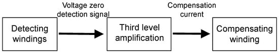 A two-stage current transformer is composed of two current transformers, and the error is determined by the excitation turns of the second-stage transformer core, which is the product of the errors of the first- and second-stage transformers. However, the accuracy level is relatively low, generally only up to 0.001 level, which cannot meet the requirements of high-precision current ratio conversion. The wiring is complex, and the compensation winding is connected in parallel with the secondary winding, and the number of turns must be equal. Changing the ratio wiring is cumbersome. The compensating current comparator uses a compensating winding that is only wound on the main iron core and not on the shielding iron core. It is connected in parallel with the secondary winding and uses the induced potential generated by the secondary winding on the shielding iron core to supply power to the additional impedance [11,12]. Its accuracy level is high and can reach the ppm level, but it is complex to use. Since it cannot generate the secondary current to be compared, it needs to be injected from the outside. When using it, an auxiliary transformer needs to be configured to achieve a zero-magnetic-flux state. The zeroing process is complicated and the measurement range is narrow. In order to improve the accuracy of the current comparator, the transformation ratio design of a single current comparator will not exceed 15. The higher the accuracy level, the fewer the transformation ratios. With the development demand of digital transformation of measurement standards and measuring instruments and equipment, high-precision measuring equipment is gradually shifting towards digitization and intelligence. To achieve fully automatic measurement of high-precision current ratios, it is still necessary to use a self-balancing current comparator based on auxiliary circuits. However, the current comparator compensated by existing auxiliary circuits cannot meet the requirements of both width-to-width ratio and high precision [13,14,15,16,17,18,19].