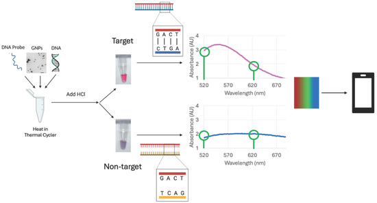 The biosensor leverages the surface plasmon resonance (SPR) properties of GNPs that arise from the collective oscillation of free electrons on the surface [59]. This oscillation peaks at a specific frequency or SPR, and results in an absorption of light that can be measured using a spectrophotometer [59]. The SPR peak location depends on the size of the GNPs [59,60]. It was shown that GNPs smaller than 30 nm have a maximum oscillation range of 500 nm to 540 nm [60,61]. The GNPs used in this assay range from 16.61 to 22.53 nm in diameter, with a peak absorption wavelength between 518 and 522 nm. When GNPs agglomerate, an SPR band shifts, producing a visible color change [60]. This phenomenon was used to differentiate target (positive) from non-target (negative) samples by adding HCl to induce aggregation. The MUDA-coated, dextrin-capped GNPs link with the aminated probe to create a GNP–probe complex. When target DNA binds to the probe, the bacterial genome surrounds the GNPs, preventing aggregation and signaling a positive result. In contrast, aggregation occurs in the absence of target DNA, indicating a negative sample. The distance-dependent nature of the SPR band enables quantification of this color change using a spectrophotometer or a cellphone app. Figure 1 shows the principle behind the biosensor assay utilizing the SPR properties of GNPs to distinguish between samples that do and do not contain target genes.