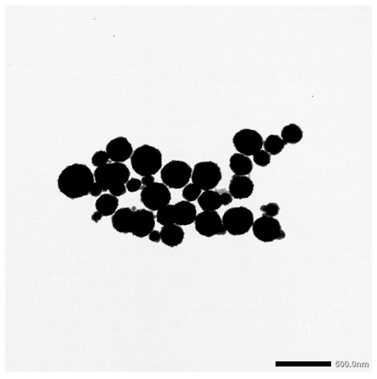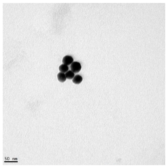 Gold nanoparticles (GNPs) were synthesized according to a method previously described [62]. The dextrin-capped GNP synthesis used gold (III) chloride trihydrate (HAuCl4), sodium carbonate (Na2CO3), dextrin, and sterile water. The GNPs were thiol-coated using 11-mercaptoundecanoic acid (MUDA) and suspended in borate buffer. The GNPs were stored at 4 °C before use. The GNPs used in this study had a peak absorbance wavelength between 518 and 522 nm. To characterize the size of the GNPs, TEM images were taken as part of a previous study, and a sample of 40 GNP diameters were measured [60]. The average diameter and standard deviation was 19.64 ± 1.39 nm and all diameters ranged from 16.61 to 22.53 nm [58]. A TEM image of GNPs synthesized using the same method as those used in this study is shown in Figure 2.