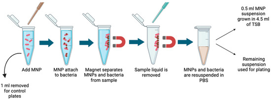 The MNPs attach to the bacteria due to electrostatic attraction coupled with the glycan–protein interaction between the MNP and bacterial proteins [43,63]. The tube was then placed on a magnetic rack at room temperature for 5 min to allow magnetic separation. Then, the supernatant was removed, and the remaining MNPs were resuspended in 1 mL of PBS. This procedure was performed in triplicate for each bacterium. This process is shown in Figure 4.