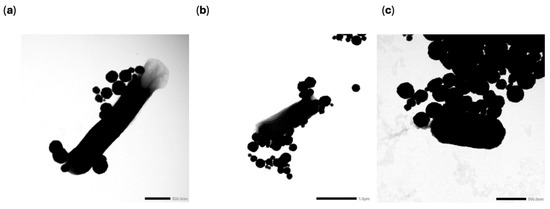 To visualize the MNP-bacterial binding of the E. coli species, TEM imaging was performed. A 0.1% uranyl acetate stain was used after the samples were fixed using a 2.5% glutaraldehyde solution and 0.1 M cacodylate buffer wash. Images were taken in the range of 5000–25,000× magnification. All three bacterial species were observed to have interactions with multiple MNPs, and no significant differences in these interactions were seen between species. This is shown in Figure 5.
