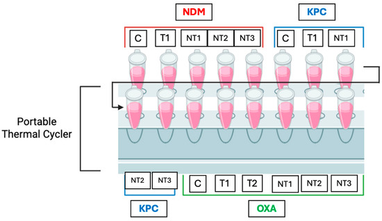Three trials were conducted for each probe using the DNA extracted from inoculated water samples. Type 1 water samples were inoculated with ~105 CFU/mL and extracted using MNPs in the abovementioned methods. For each trial, a control, target(s), and three non-targets were tested for all probes. The target for blaNDM-1 was E. coli BAA-2471 and the target for blaKPC-3 was E. coli BAA-2340. For the blaOXA-1 probe, both E. coli BAA-2471 and E. coli BAA-2340 were used as the targets. For all probes, E. coli C-3000 (NT1), E. cloacae (NT2), and S. aureus (NT3) were used as non-targets for comparison. The genes present in the inoculated samples were confirmed using the PCR methods described above. To explore the biosensor’s portability, a hand-held, portable thermal cycler (VWR International) was used instead of a standard-sized laboratory thermal cycler. For each thermal cycling procedure, one trial from each probe was included in the thermal cycle. The thermal cycler had a total of 16 tube positions, and one run accommodated one trial for each probe (5 tubes for blaNDM-1, 5 tubes for blaKPC-3, and 6 tubes for blaOXA-1). The order of tube placement was standardized to provide a simple method of loading and unloading the thermal cycler, while keeping track of which tubes contained which probe. This placement is shown in Figure 6.