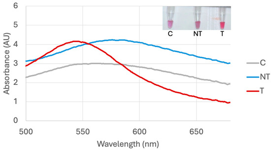 The optimal HCl volume was determined by adding varying volumes of HCl and observing the color change in the biosensor response in a target, non-target, and control sample 10 min after HCl addition. The optimal volume occurred when the target sample remained visibly red and the non-target and control turned blue. Optimization testing for blaNDM-1 and blaOXA-1 was conducted in a previous study, and resulted in optimal volumes of 5 μL and 6 μL, respectively, for DNA extracted through boiling [58]. The blaKPC-3 probe visual and spectral result for the optimal 8 μL are shown in Figure 7.