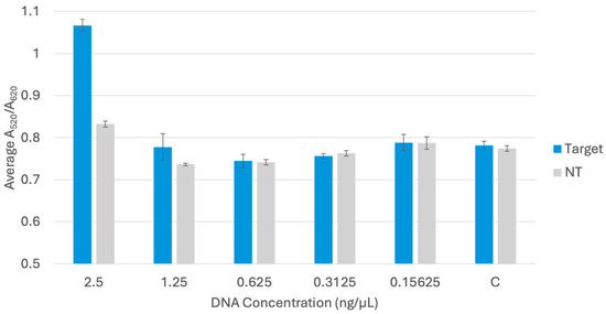 A limit of detection (LOD) test was conducted to determine the lowest concentration of target DNA extracted from pure cultures that could be detected by the biosensor. LOD testing was conducted for blaNDM-1 and blaOXA-1 in a previous study, following the same procedure, and resulted in an LOD of 0.625 ng/μL for both probes with pure culture DNA extracted through boiling [58]. A series of five trials was conducted for the blaKPC-3 probe, and the average A520/A620 was compared between target (E. coli BAA-2340) and non-target (E. coli C-3000) samples at the same concentration and a water control. The LOD results for blaKPC-3 are shown in Figure 8.