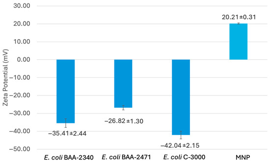 To estimate the surface charge of E. coli and MNPs, a Zetasizer (Malvern) was used to measure the zeta potential of the surfaces in triplicate. Figure 9 shows the results from the zeta potential measurements for the resistant E. coli (BAA-2340 and BAA-2471), the susceptible E. coli C-3000, and MNPs in water.