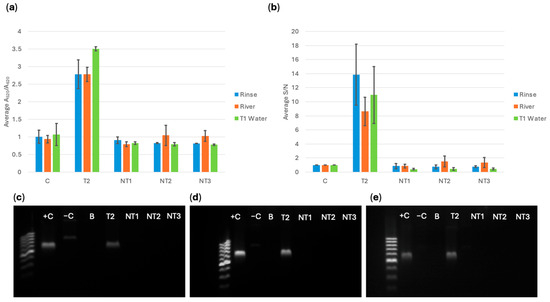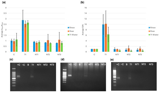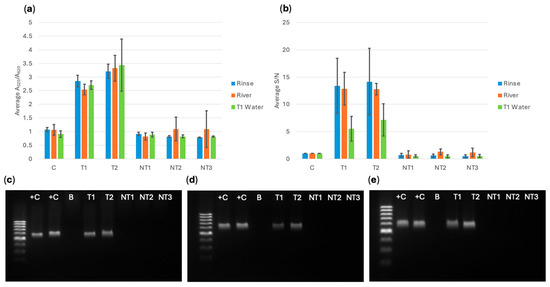 (a) blaOXA-1 probe spectral average A520/A620 ratio compared to (b) cellphone average S/N value comparing E. coli BAA-2471 (T1) and E. coli BAA-2340 (T2) to E. coli C-300 (NT1), E. cloacae (NT2), S. aureus (NT3) extracted from a water sample and a water control, and PCR verification for blaOXA-1 in bacteria magnetically captured from (c) turkey rinse, (d) river water, and (e) type 1 water using pure culture E. coli BAA-2471 (+C), E. coli BAA-2340 (+C), a blank of AE buffer (B), and MNP-extracted bacterial DNA E. coli BAA-2471 (T1), E. coli BAA-2340 (T2), E. coli C-3000 (NT1), E. cloacae (NT2), and S. aureus (NT3).