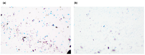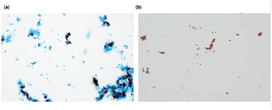 (a) E. coli BAA-2471 with MNP with limited clumping and MNP–bacterial binding and free MNPs without bacterial binding; (b) E. coli BAA-2471 showing limited methylene blue-dyed cells and MNP–bacterial binding.