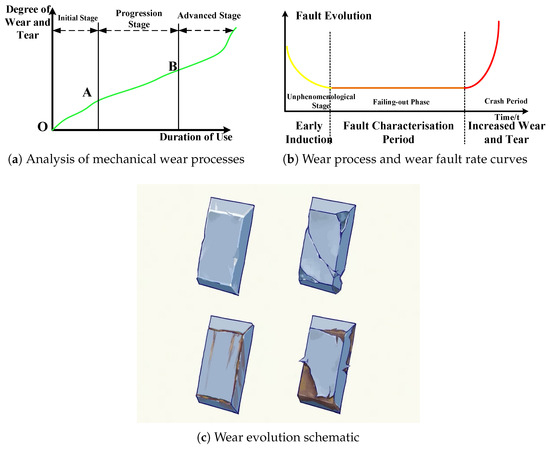 As shown in Figure 1a, the break-in stage is also known as the run-in stage. The surface roughness of the new friction sub-surface is relatively large, the true contact area is small, and the local stress is large, so the surface is gradually smoothed out at the beginning of the use stage, and the wear rate is large. As the break-in proceeds, the true contact area gradually increases, and the wear rate begins to slow down, as shown by the figure’s O–A line segment. The stable wear-stage wear process is slow and stable, as seen in the figure’s A–B line segment; after the run-in, the friction surface processing hardens, the micro-geometry changes, conditions of elastic contact are established, then the wear stabilizes; the amount of wear grows in proportion to the time. In this stage, the wear rate is basically unchanged [32]. The intense wear stage occurs after a long period of stable wear; the friction conditions have changed greatly; for example, friction between the surface of the gap increases, the surface temperature is too high, and there are changes in metal organization, resulting in a sharp increase in wear. At this point, the mechanical efficiency decreases, there is a loss of precision, abnormal noise and vibration, and the friction temperature rises rapidly, ultimately leading to failure of the parts, as shown in the figure after the B point of the line segment. Figure 1c, on the other hand, shows a schematic representation of mechanical wear.