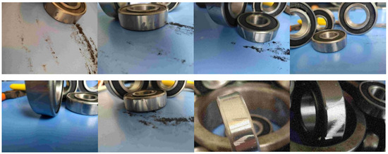 This study utilizes high-speed aviation bearing test samples, with raw wear images captured for early fault characterization. Three primary types of failure are identified: notches, abrasions, and scratches. Each image may contain one or more of these failure modes, which appear on different surfaces of the bearing or along the annular flanks. Abrasions range from centralized to dispersed and are often subject to occlusion and external interference. Representative images are shown in Figure 2.