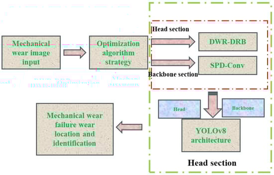 The improved mechanical wear fault diagnosis algorithm based on the YOLOv8 architecture (Figure 3) introduces the DWR-DRB module in the backbone part: it expands the sensory field through multi-branch expansion convolution (13 × 13 large kernel with a parallel structure of 3 × 3; expansion rate 6), which combines with structural reparametrization techniques to enhance the extraction of small wear (e.g., <0.1 mm scratches) and occlusion features; in the head part, the SPD-Conv module is used to convert the spatial dimension to the depth dimension to preserve the wear morphology details and maintain the resolution by non-spanning convolution; the loss function incorporates Focaler-MPDIoU to dynamically weight the difficult samples and optimize the bounding-box regression, and to improve the localization accuracy by using the minimum point distance. These three synergies significantly improve the fault identification performance, with an mAP50 of 91%.