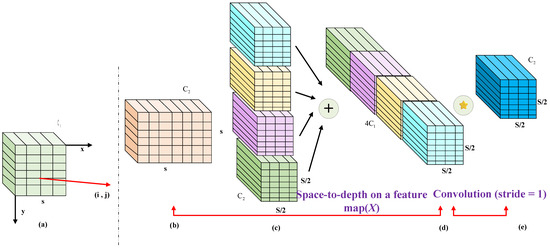 (b) Rearrangement of spatial pixel blocks into the depth (channel) dimension using a space-to-depth operation, increasing the number of channels to 4.